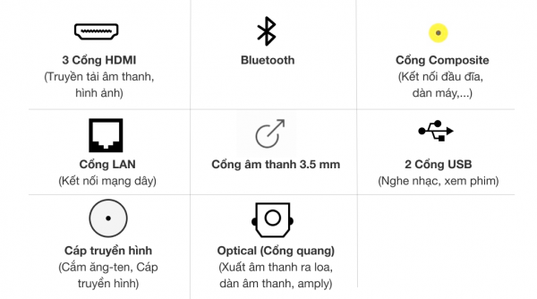 - Cổng xuất âm thanh: 1 cổng 3.5 mm, 1 cổng Optical (Digital Audio)