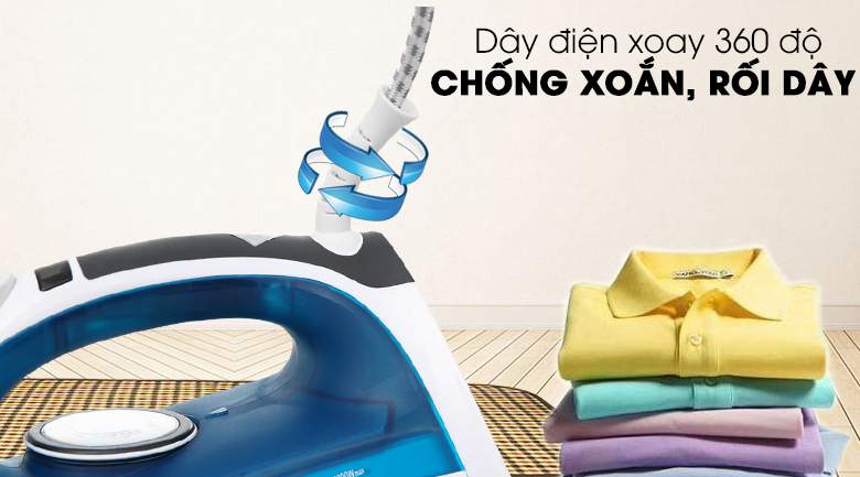 Dây điện xoay 360 độ di chuyển bàn ủi linh hoạt khi thao tác ủi, tránh xoắn dây