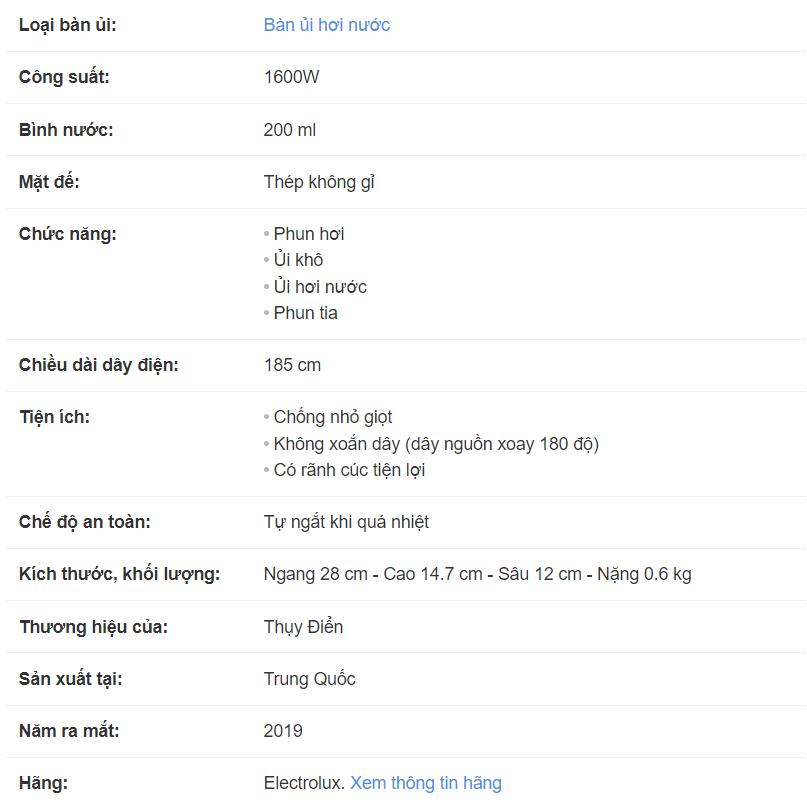 Bàn ủi Electrolux màu sắc tươi sáng, đẹp mắt, công suất lớn 1600W ủi thẳng quần áo nhanh