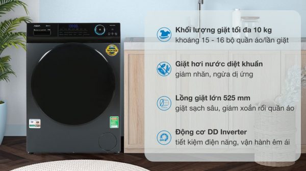 – Khối lượng giặt tối đa: 10 kg, máy phù hợp sử dụng cho nhu cầu giặt giũ của các gia đình có 5 – 7 thành viên, hoặc các gia đình có ít thành viên hơn nhưng nhu cầu giặt giũ cao, có thói quen để dồn quần áo giặt 1 lần trong tuần.