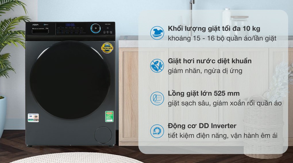 Nhìn chung, máy giặt Aqua Inverter 10 kg AQD- D1002G BK thích hợp cho các gia đình có từ 5 – 7 thành viên với nhu cầu giặt giũ cao. Đặc biệt, với chế độ giặt hơi nước giúp diệt khuẩn, ngăn ngừa dị ứng, an toàn cho những người có làn da nhạy cảm dễ bị mẩn đỏ (trẻ nhỏ).