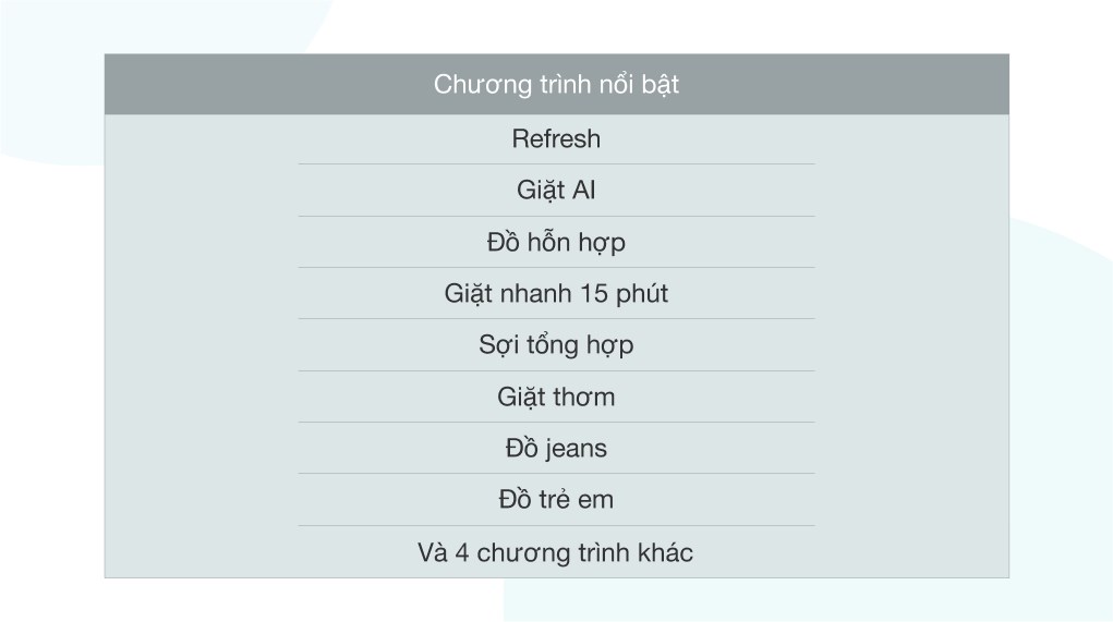 – Tích hợp 12 chương trình phù hợp với nhiều chất liệu quần áo khác nhau: Giặt đồ cotton, sợi tổng hợp, đồ hỗn hợp, đồ trẻ em, jeans, giặt diệt khuẩn, giặt làm mới (Refresh),… (xem thêm tại bảng thông số kỹ thuật). Chương trình giặt Refresh mang hơi nước nóng len lỏi vào từng sợi vải, loại bỏ mùi hôi và nếp nhăn, giữ quần áo trông như mới.