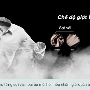 – Giặt hơi nước: hơi nước và bột giặt được khuếch tán bên trong lồng giặt ở nhiệt độ 60°C đến 90°C giúp thẩm thấu vào quần áo tốt hơn, nhanh chóng loại bỏ các vết bẩn cứng đầu, đồng thời giúp loại bỏ vi khuẩn và các chất gây dị ứng, an toàn cho da nhạy cảm.