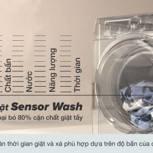 Công nghệ Sensor Wash với sự kết hợp giữa 2 loại cảm biến trước khi giặt và sau khi giặt, tự động cảm biến độ bẩn và kết hợp chương trình xả sau giặt tùy theo vết bẩn, làm nâng cao hiệu quả giặt sạch và giảm bụi, cặn.
