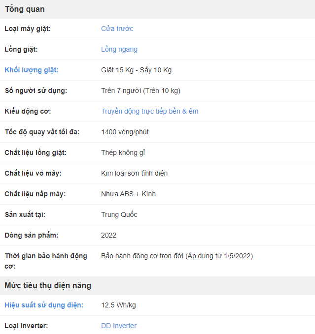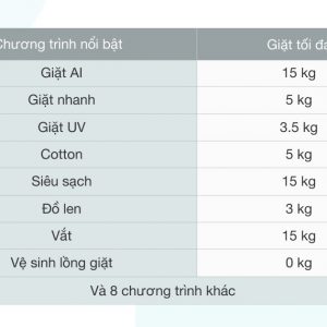 – Khối lượng giặt tối đa: 15 kg, sấy 10 kg, phục vụ tốt cho nhu cầu giặt giũ của các gia đình có trên 7 thành viên hoặc gia đình, nhóm bạn có ít thành viên hơn nhưng có tần suất giặt cao, thói quen gom đồ để giặt trong 1 lần/tuần để tiết kiệm điện, nước và công sức hơn.