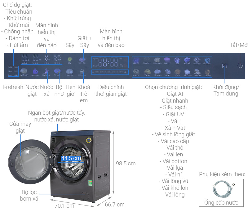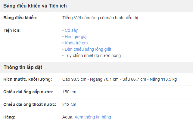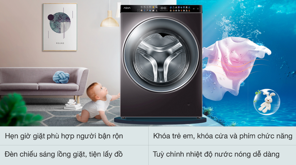 – Máy giặt Aqua có 16 chương trình giặt được cài đặt sẵn: giặt AI, giặt nhanh, giặt UV, vải cao cấp, vải lông, giặt siêu sạch,… (xem thêm tại bảng thông số kỹ thuật). Trong đó, chương trình giặt Al tự động xác định khối lượng giặt, phân bổ lượng nước giặt/xả, phân biệt chất liệu vải qua khả năng hấp thụ nước giúp giặt quần áo sạch sâu, kéo dài độ bền vải và tối ưu chi phí giặt.