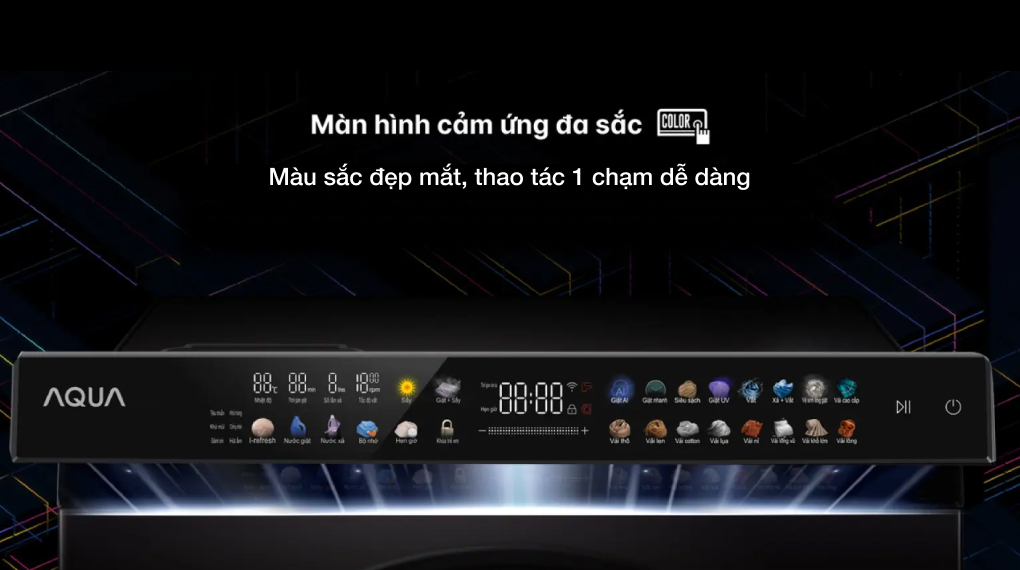 – Bảng điều khiển cảm ứng tiếng Việt thân thiện, có màn hình hiển thị rõ ràng, các biểu tượng màu sắc sinh động, dễ hiểu, dễ phân biệt, cho bạn tùy chọn các chức năng dễ dàng, chính xác.