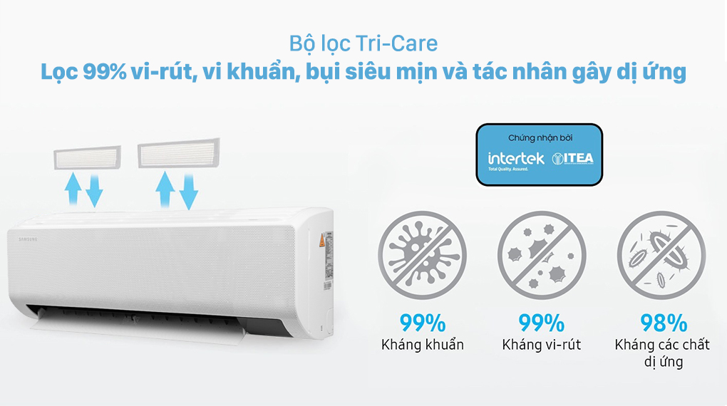 Được chứng nhận bởi tổ chức quốc tế ITEA và Intertek, bộ lọc 3 lớp Tri-Care gồm các lớp lọc mật độ cao với lớp phủ Zeolite giúp lọc các hạt bụi mịn, loại bỏ 99% vi-rút, vi khuẩn và tác nhân gây dị ứng. Nhờ vậy, bạn có thể tận hưởng những luồng không khí trong sạch nhất có thể, bảo vệ sức khỏe.