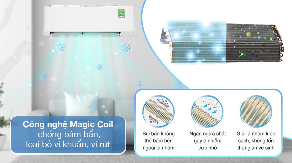 – Công nghệ Magic Coil phủ lớp chống bám bẩn trên bề mặt lá nhôm không để nước đọng lại, dễ dàng trôi đi và cuốn theo bụi bẩn, không tạo môi trường cho bụi bẩn, vi khuẩn, nấm mốc tích tụ. Nhờ đó, giúp giảm điện năng tiêu thụ, nâng cao hiệu suất làm lạnh nhanh, tối ưu khả năng lọc khí, tiết kiệm chi phí vệ sinh, bảo trì thiết bị.