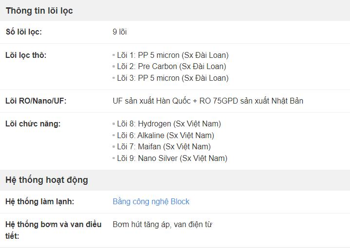 – Lõi Nano Silver (Sx Việt Nam): Bổ sung khoáng và các chất điện giải có ích cho cơ thể. Diệt khuẩn và chống tái nhiễm khuẩn.