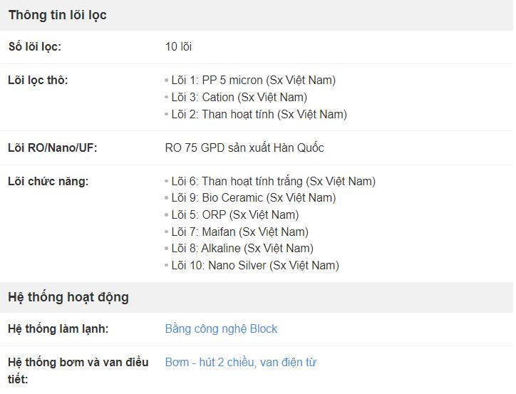 - Lõi Nano Silver (Nano Bạc): Diệt khuẩn, khử mùi, cân bằng pH, tạo khoáng và vị ngọt tự nhiên cho nước.