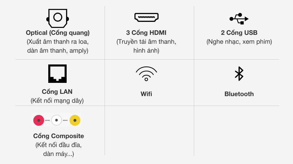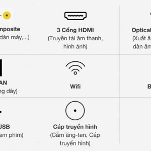 - Cổng nhận hình ảnh, âm thanh: 3 cổng HDMI có 1 cổng HDMI eARC (ARC), 1 cổng Composite