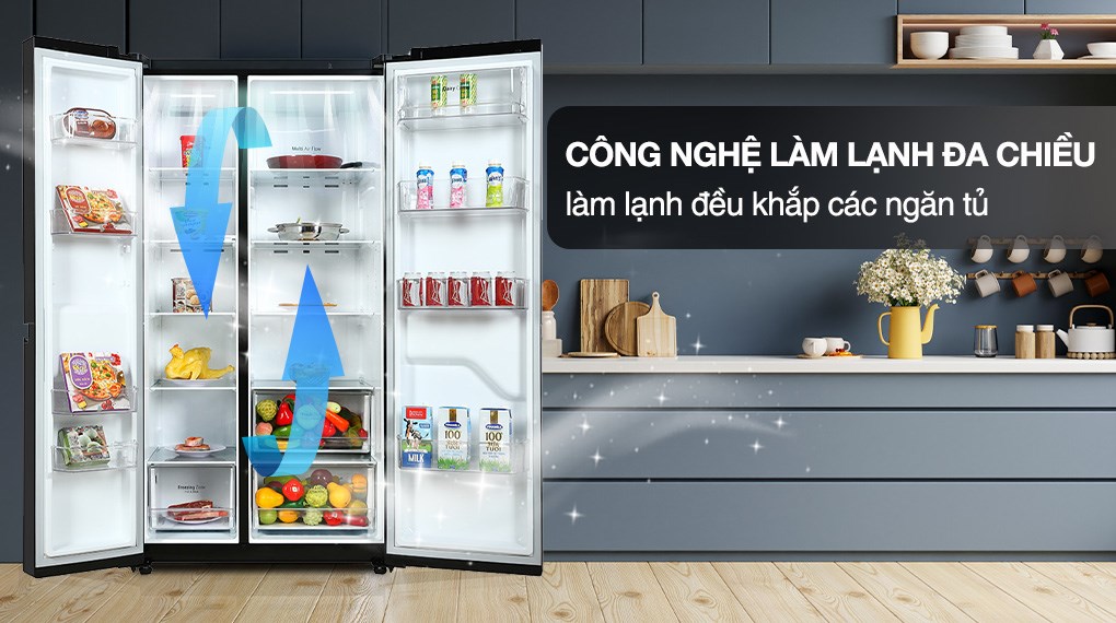 – Hệ thống làm lạnh đa chiều đem hơi lạnh đến mọi nơi phía trong tủ, giúp cho thực phẩm bên trong giữ được trạng thái tươi ngon trong thời gian dài.