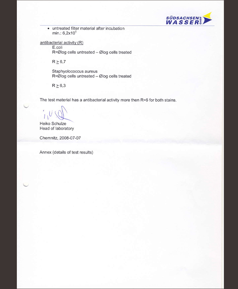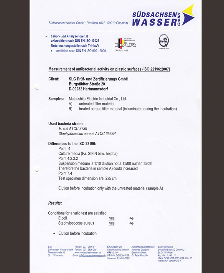 Công nghệ diệt khuẩn Blue Ag+ có thể diệt được khuẩn E.coli và khuẩn tụ cầu vàng Staphylococcus aureus, nguyên nhân gây bệnh đường ruột và kích ứng da, đã được cấp chứng nhận bởi Sudsachsen Wasser (Đức).