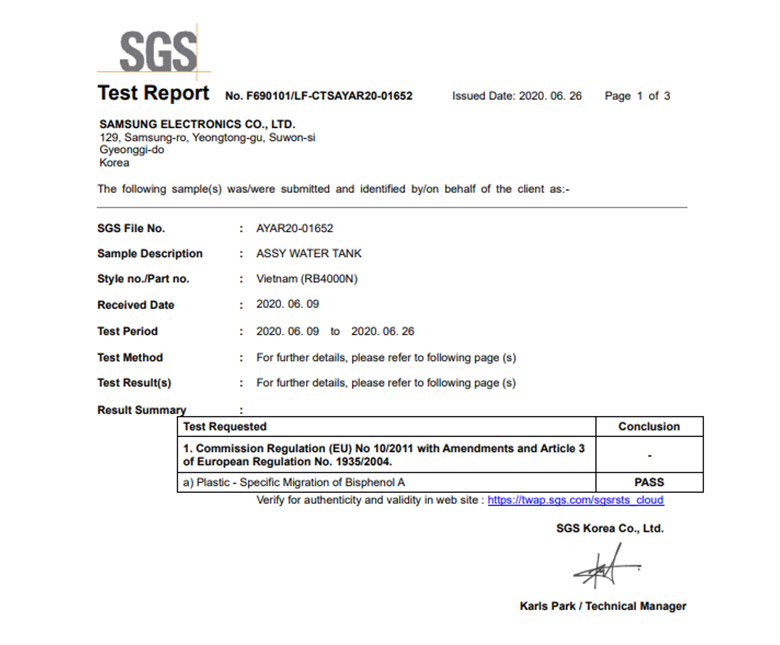 Giấy kiểm chứng chất liệu nhựa không chứa chất BPA gây ung thư, được cung cấp bởi Tổ chức chứng nhận kiểm định chất lượng quốc tế SGS có trụ sở tại Geneva Thụy Sĩ.